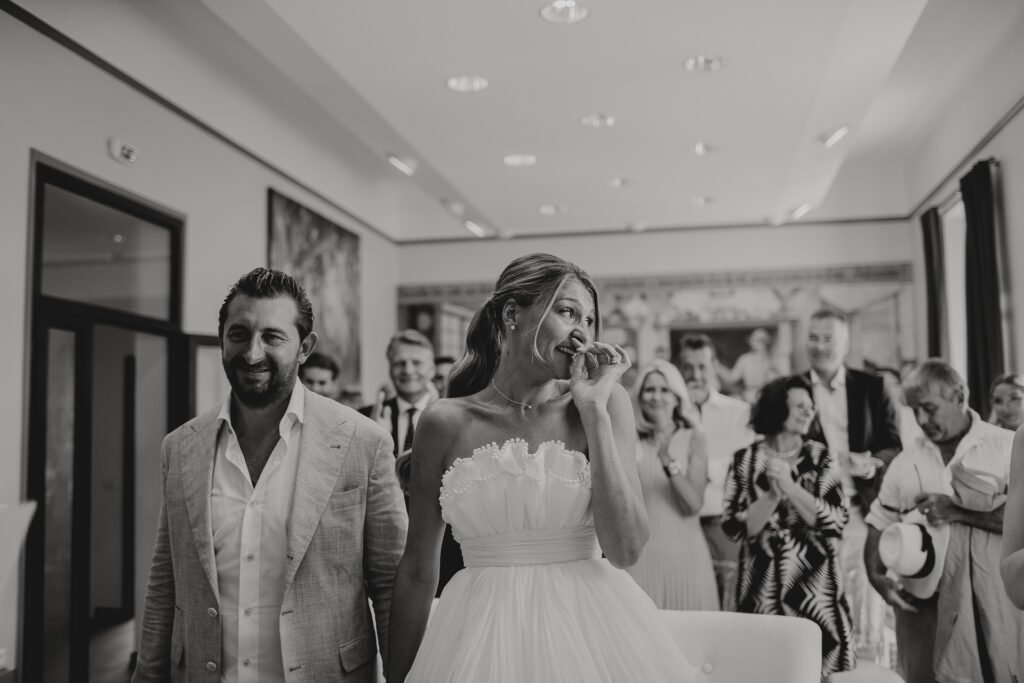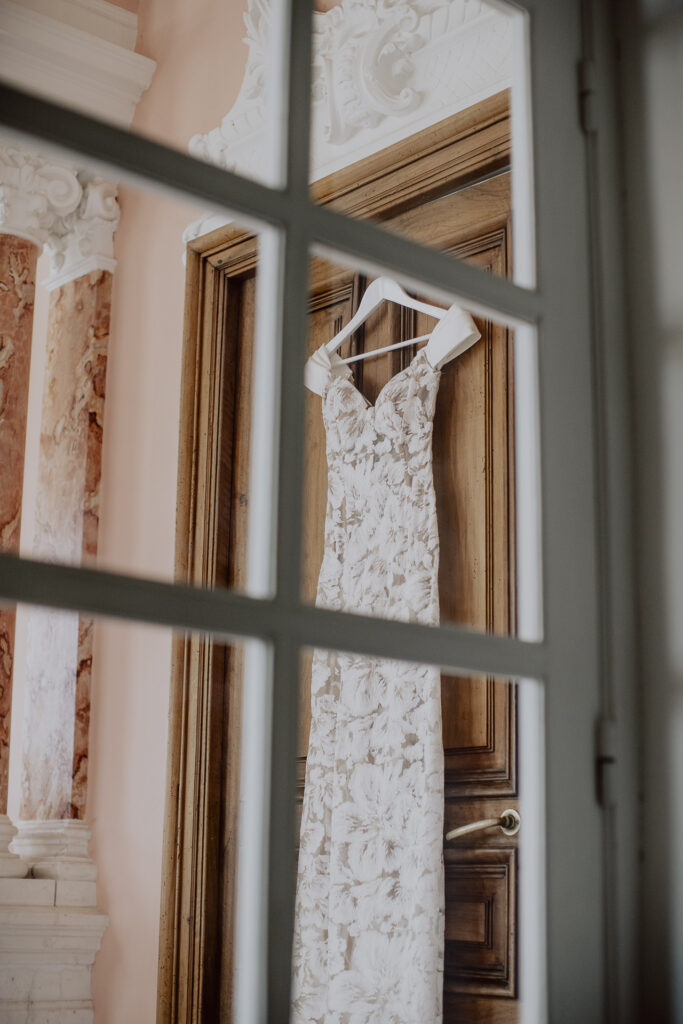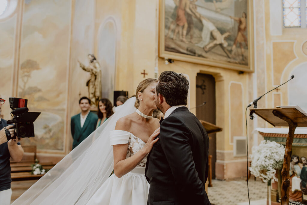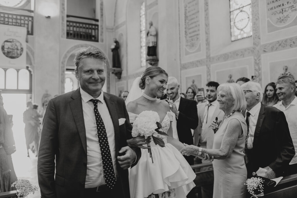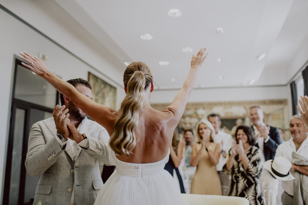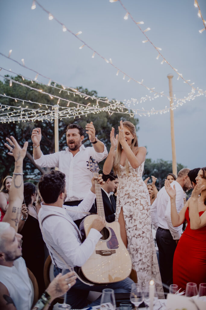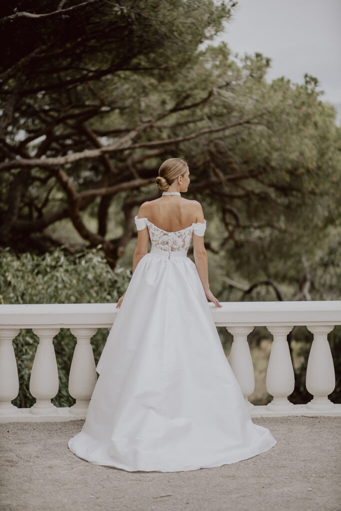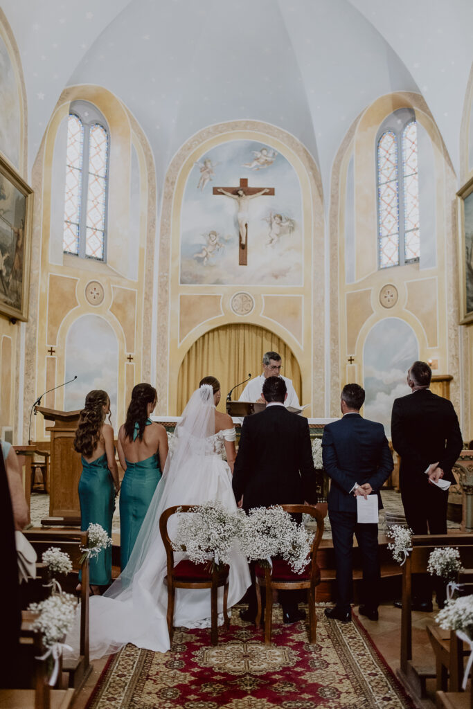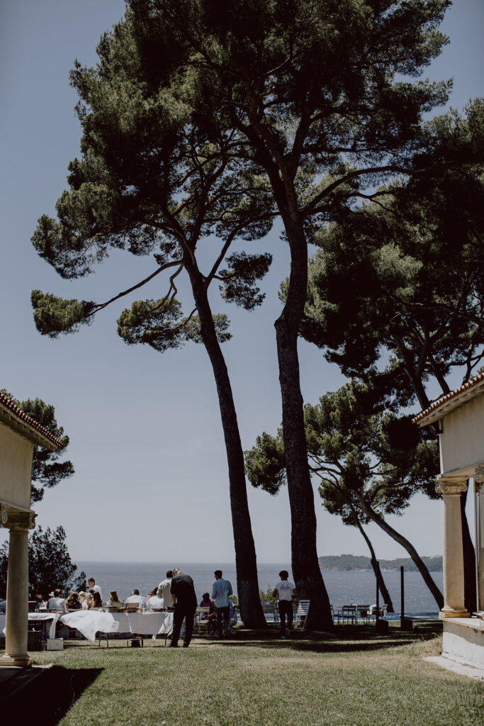 Le moment fort de cette épopée fut sans nul doute la cérémonie religieuse. C’est à l’église de Giens, perchée fièrement sur sa presqu’île, que nos deux mariés se sont dit « Oui ». Si pour la cérémonie civile à Bormes les Mimosas, Laurène avait choisi une magnifique robe courte Rime Arodaky mais pour la cérémonie religieuse, son choix s’est porté sur une robe Nicolas Fafiotte en deux partie afin d’enlever le jupon supérieur pour la soirée. Elle était sublime!