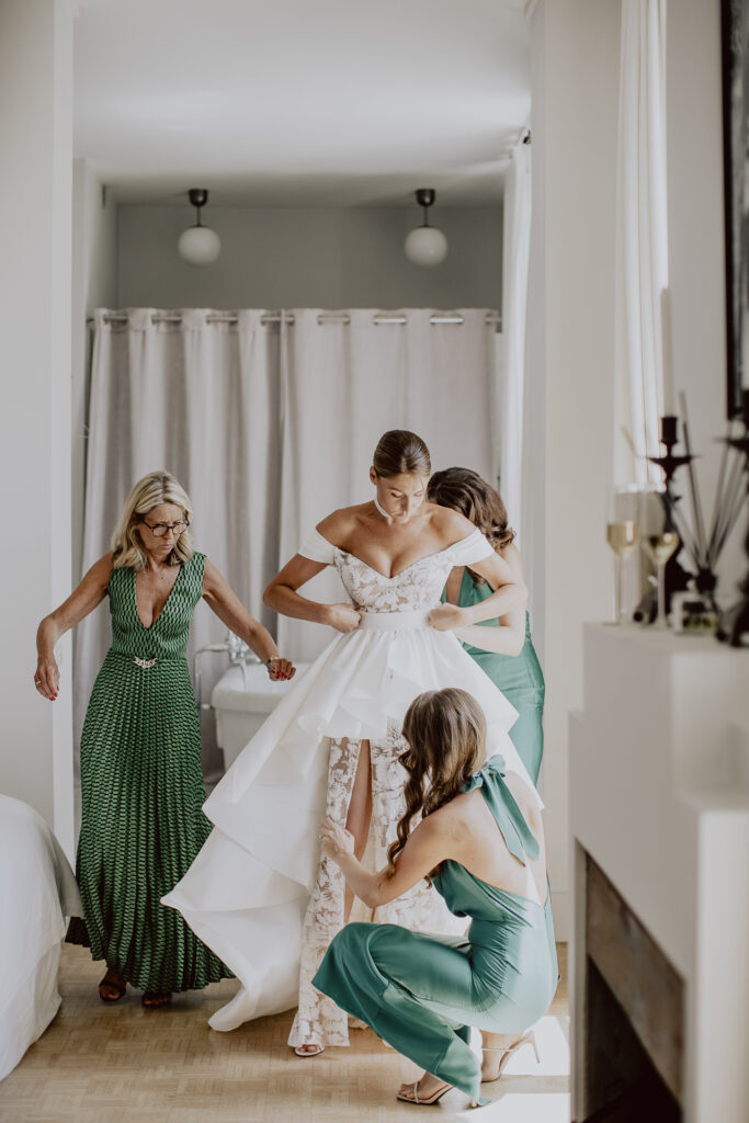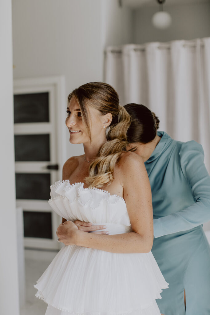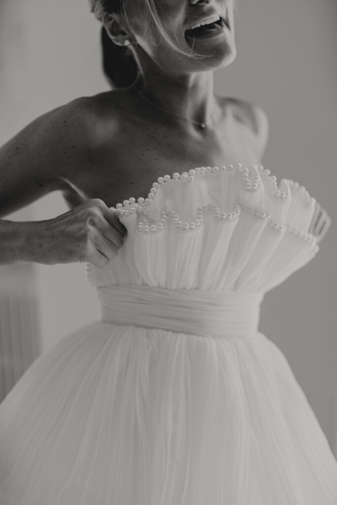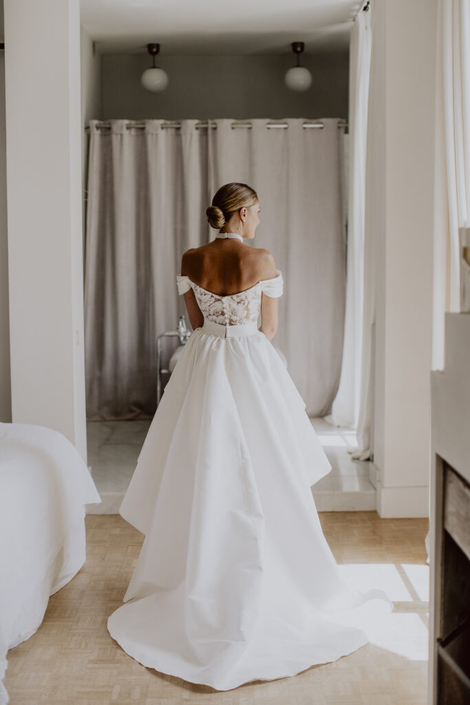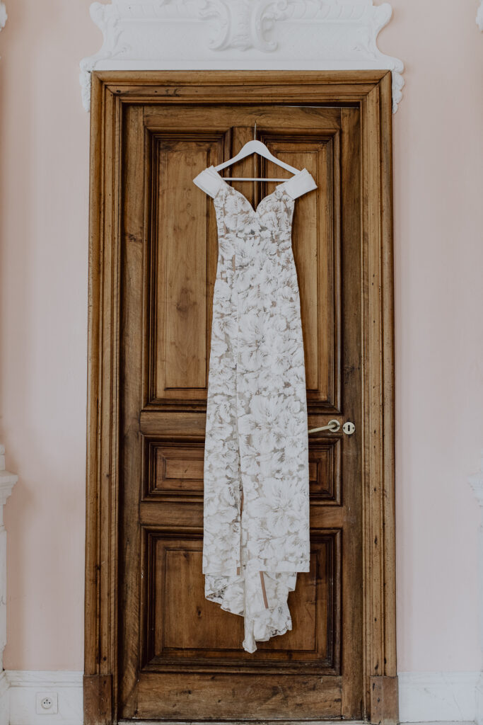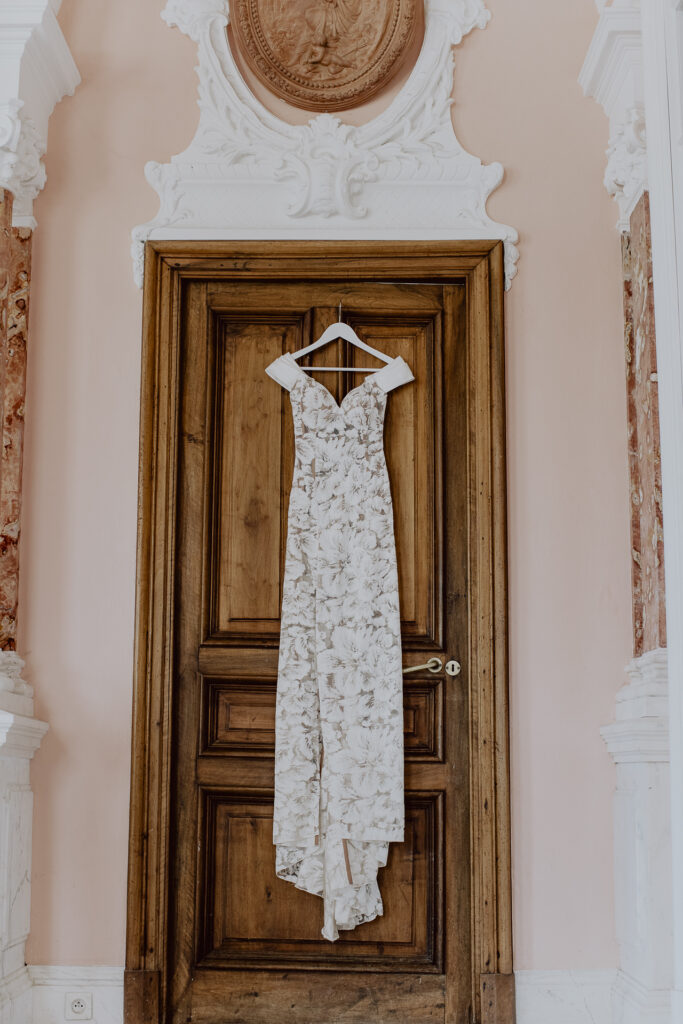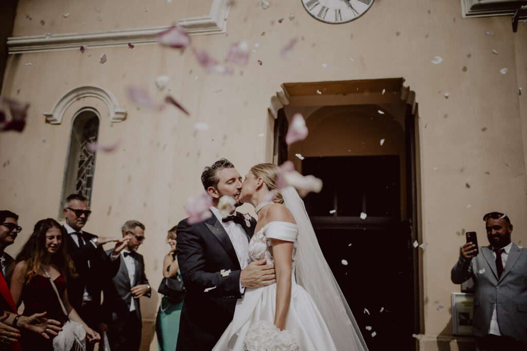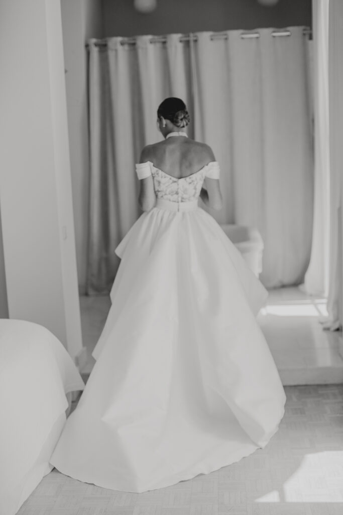 Le moment fort de cette épopée fut sans nul doute la cérémonie religieuse. C’est à l’église de Giens, perchée fièrement sur sa presqu’île, que nos deux mariés se sont dit « Oui ». Si pour la cérémonie civile à Bormes les Mimosas, Laurène avait choisi une magnifique robe courte Rime Arodaky mais pour la cérémonie religieuse, son choix s’est porté sur une robe Nicolas Fafiotte en deux partie afin d’enlever le jupon supérieur pour la soirée. Elle était sublime!