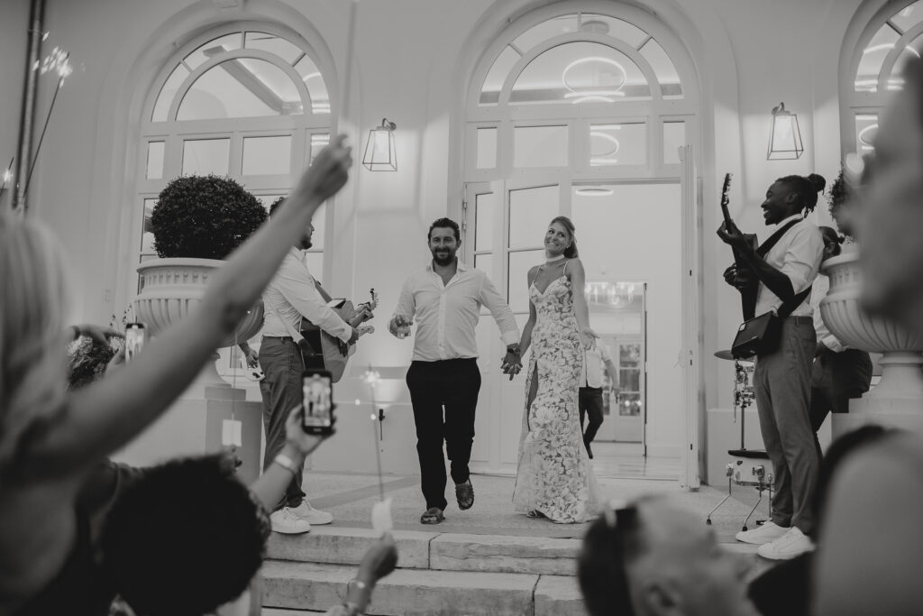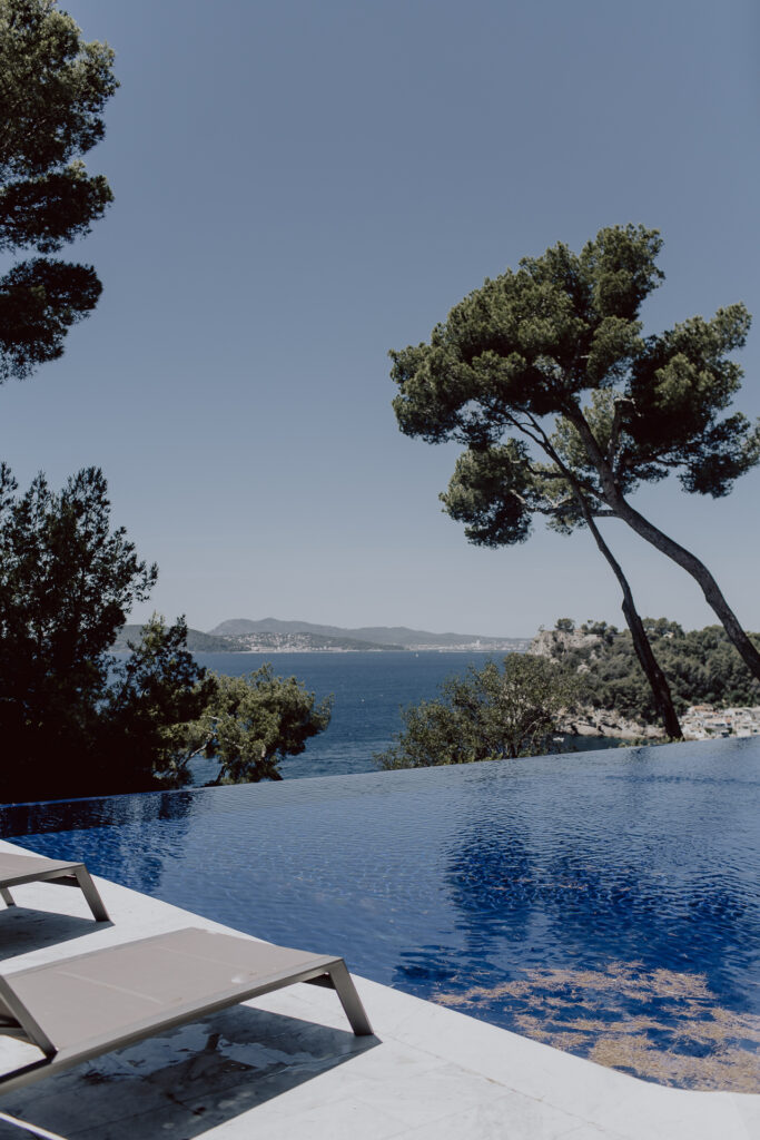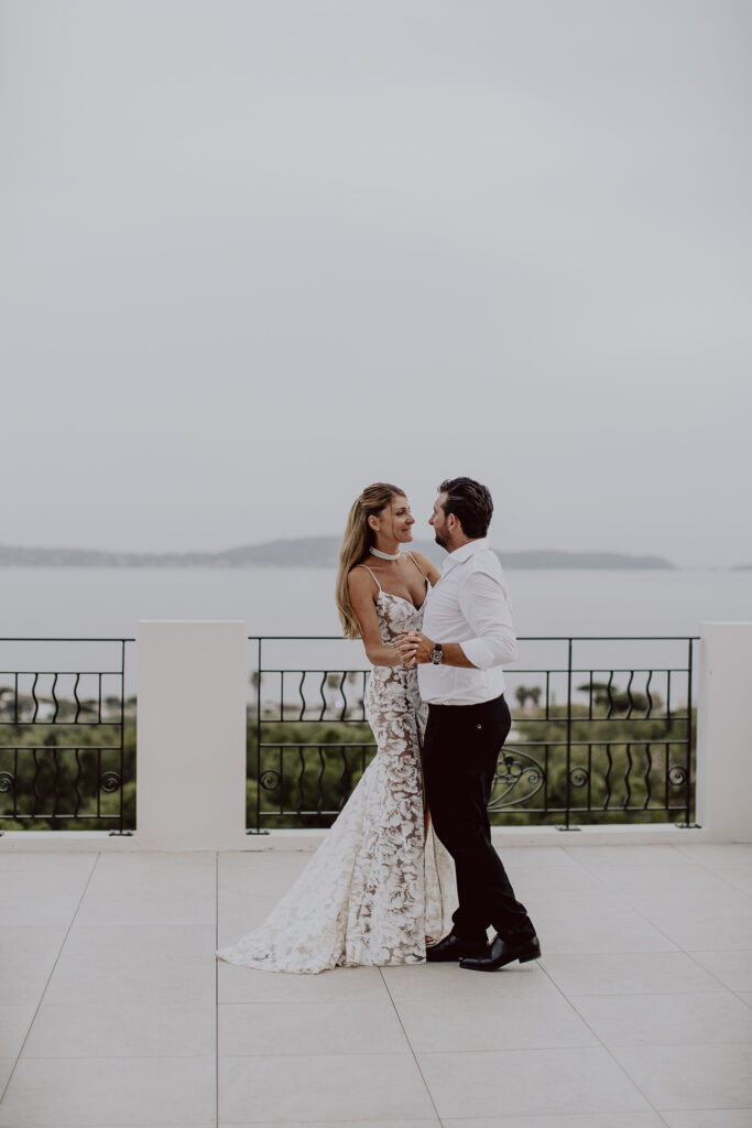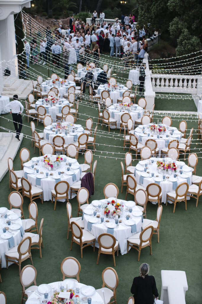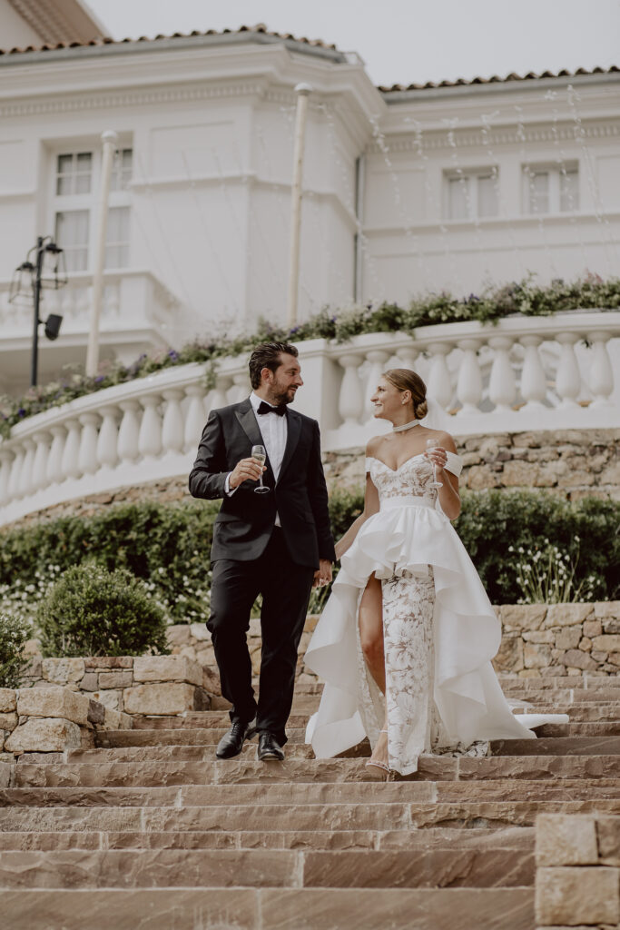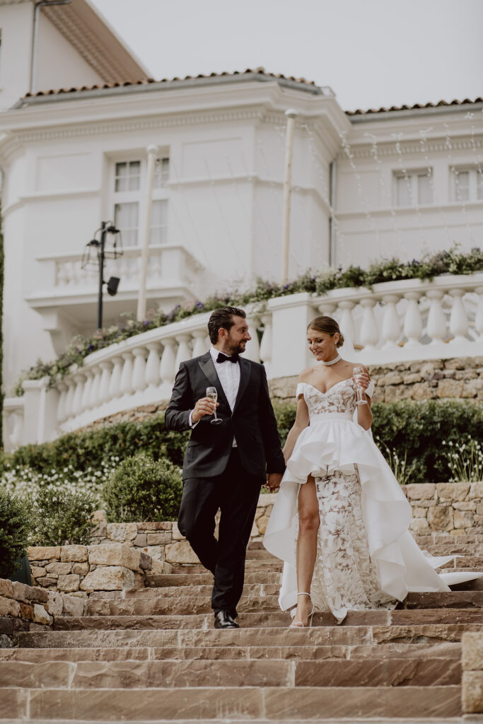 Pour clore cette journée mémorable, la réception s’est tenue au Castel Bay à Hyères. Ce lieu emblématique, mêlant architecture néoclassique et modernité, a offert un cadre spectaculaire pour le dîner de noces.