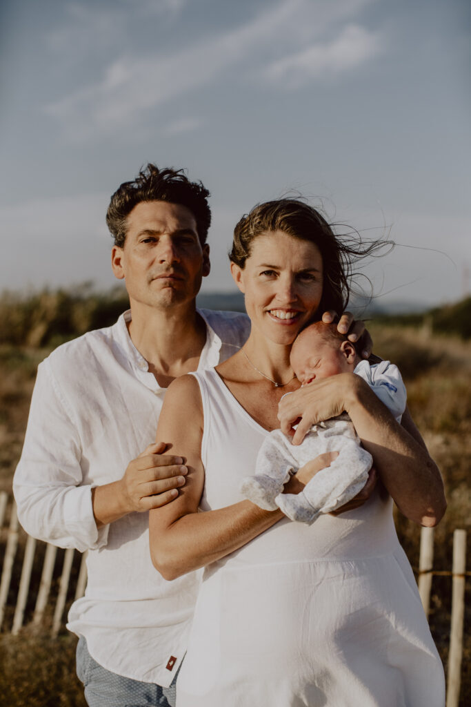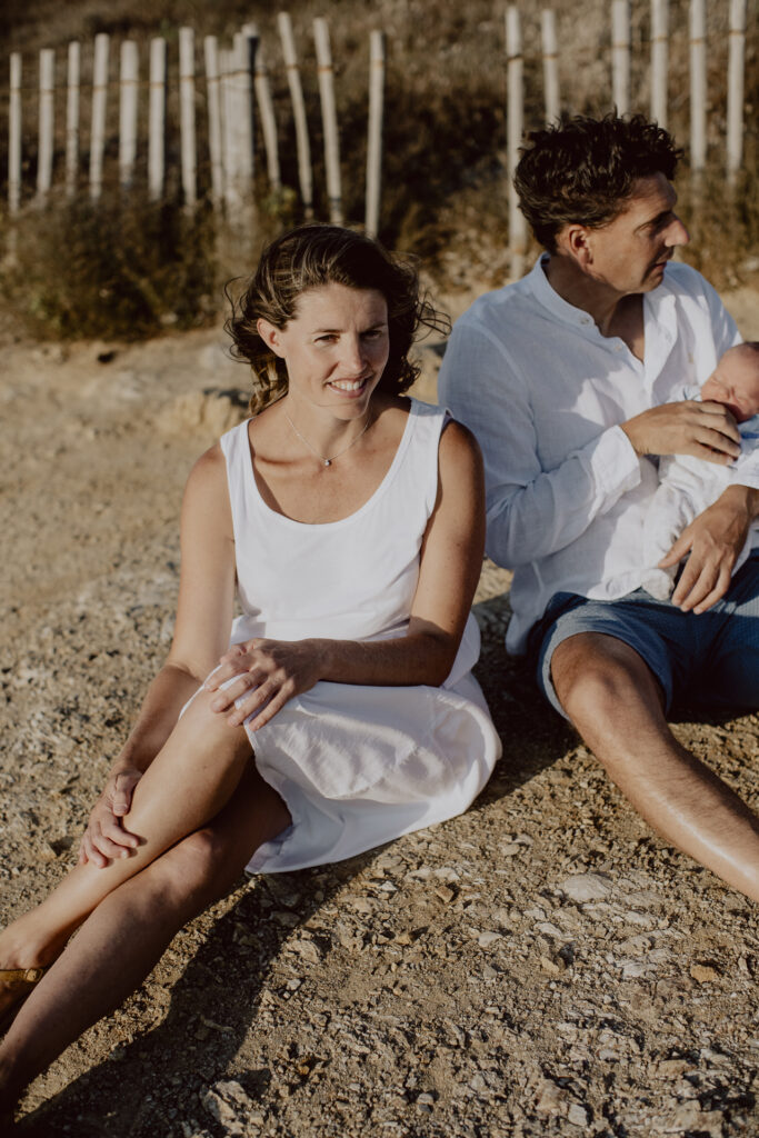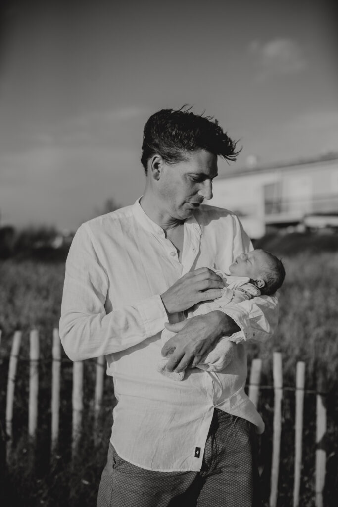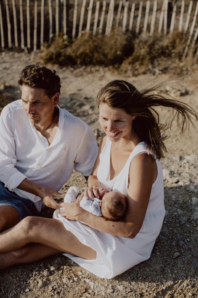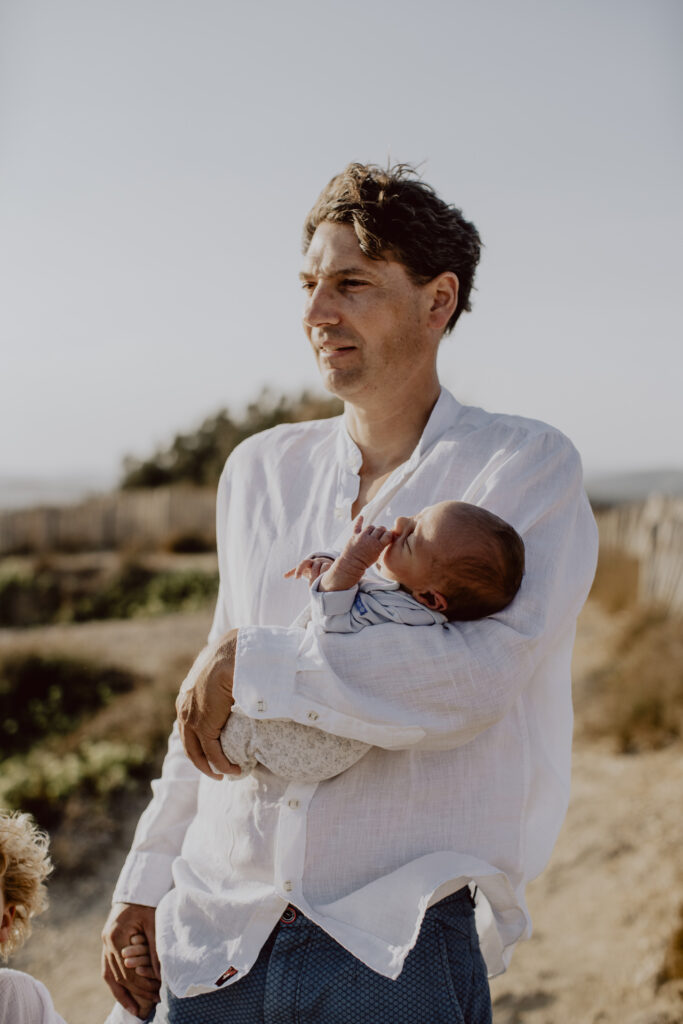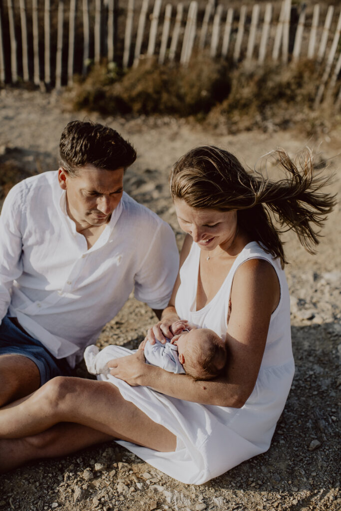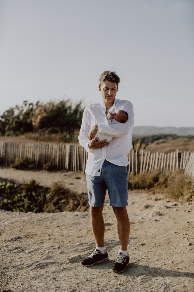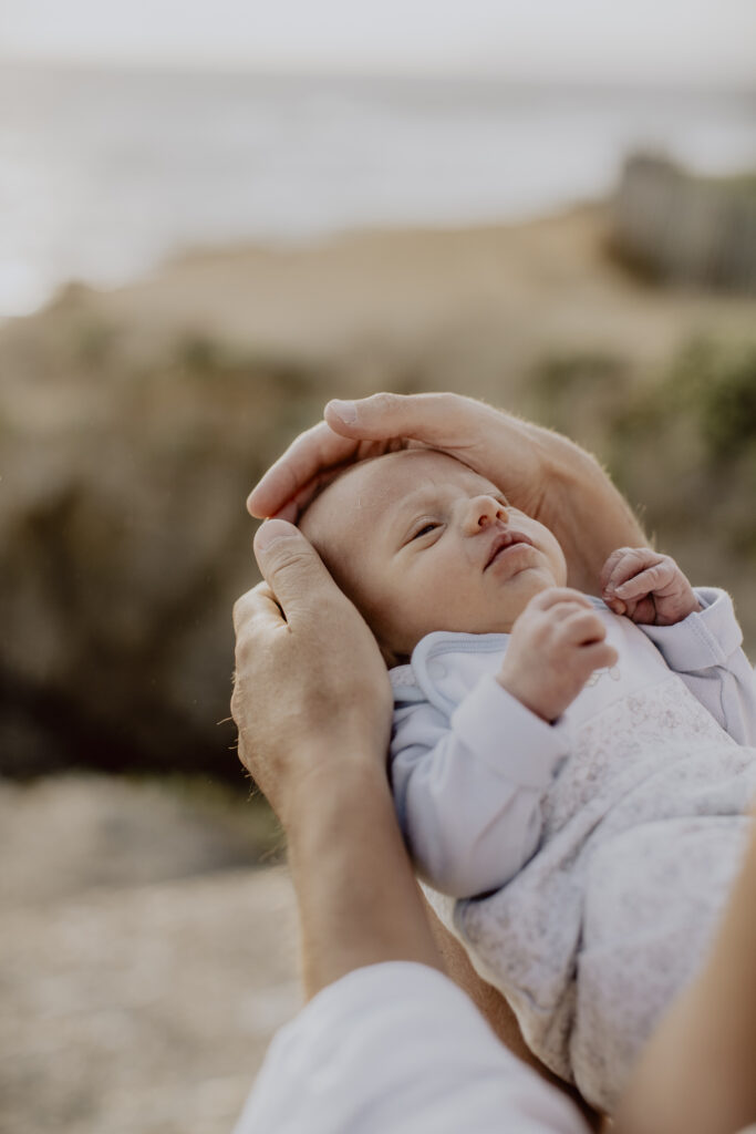 L’été indien prolonge souvent sa magie sur nos côtes, offrant des lumières encore plus spectaculaires qu’en plein cœur de la saison estivale. Photographe bébé à la mer j’ai réalisé cette magnifique séance photo et elle en est la preuve éclatante. Elle met en scène une jeune famille dans un cadre naturel et apaisant, avec un détail particulièrement touchant : la présence d’un nouveau-né, âgé d’à peine une semaine, sereinement bercé dans les bras de son papa.