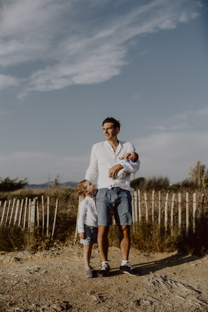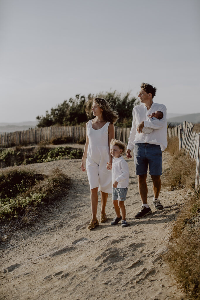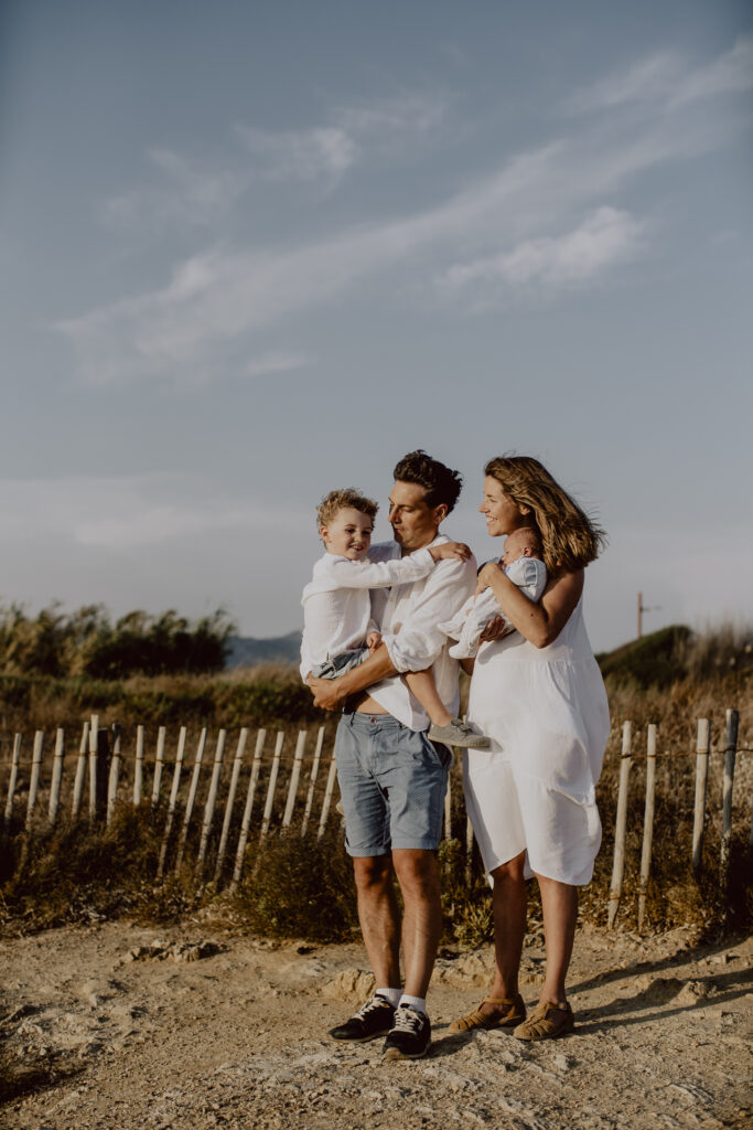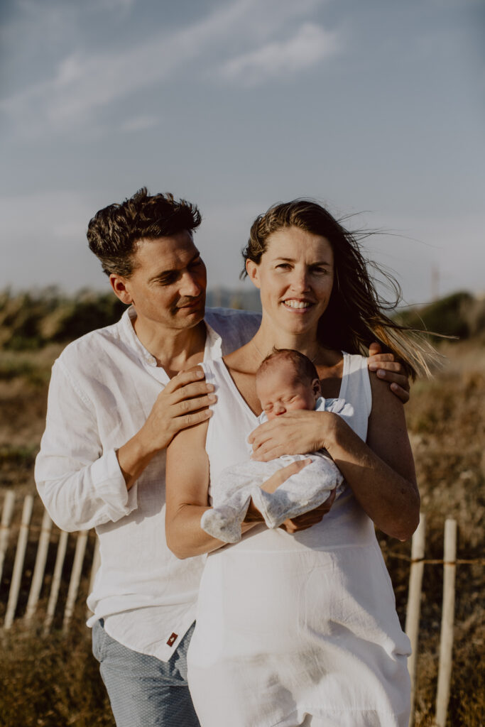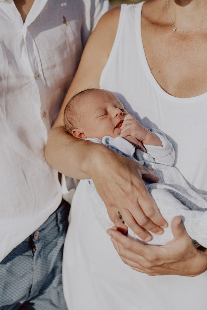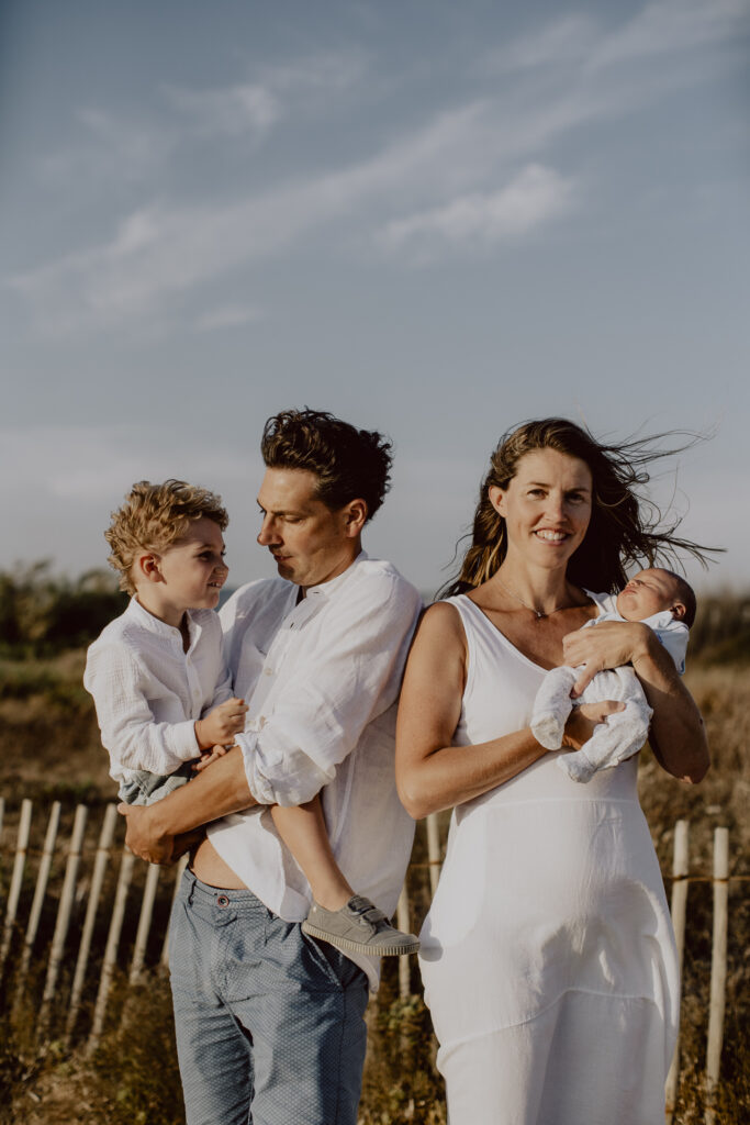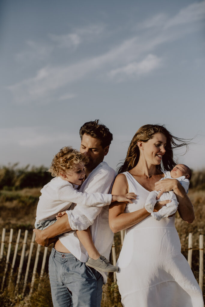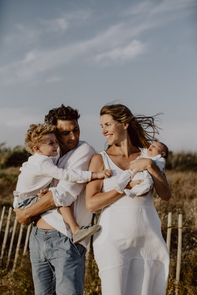 L’été indien prolonge souvent sa magie sur nos côtes, offrant des lumières encore plus spectaculaires qu’en plein cœur de la saison estivale. Photographe bébé à la mer j’ai réalisé cette magnifique séance photo et elle en est la preuve éclatante. Elle met en scène une jeune famille dans un cadre naturel et apaisant, avec un détail particulièrement touchant : la présence d’un nouveau-né, âgé d’à peine une semaine, sereinement bercé dans les bras de son papa.